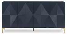 Elevate your aesthetic with the chic design of this accent cabinet. Sleek goldtone legs and striking doors with a geometric pattern infuse contemporary flair wherever you place this piece. Add a dark blue finish, and you've got a stunning showstopper. Providing function to form, the cabinet's push magnetic doors reveal two shelves and openings for electronics.