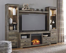 Entertain a rugged yet refined sense of style with this entertainment center. Rustic finish and plank-style details pay homage to reclaimed barn wood, while metal banding with nailhead accents infuses a touch of industrial cool. Ultra clean lines ensure a look that can go from the country to the city and feel equally at home. What really turns up the heat: an electric infrared fireplace insert with faux firebrick surround that operates with or without infrared heat and includes a multi flame feature, 7-level temperature setting, five brightness levels and LED glowing embers effect.