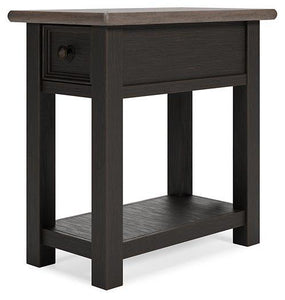 Quality crafted and richly styled, this rectangular chairside end table is sure to charm. Its two-tone aesthetic pairs a weathered grayish brown tabletop with a textured wire brushed base in black. A built-in shelf offers handy display space. And the table's integrated 110V power supply and dual USB charging ports make it so easy to keep your personal devices powered up.